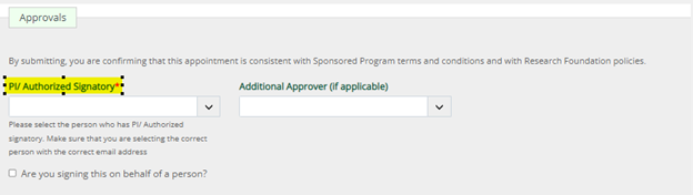 - The PI/Authorized Signatory field is directly linked to ones b-mail. If the PI/Authorized Signatory is the Originator of the form the e-form, once submitted, will flow directly to Human Resources (or additional approver if applicable). If the Originator is different than the PI/Authorized signatory, the e-form will route to the PI/Authorized Signatory for approval (and additional approver if applicable) and then to Human Resources for final review and inputting.