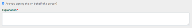 - Select this box if you are completing the e-form on behalf of a Principle Investigator. Use the Explanation box to support this action (ie: Signature Authority).