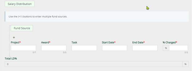 - Note: The % Charged field must reflect the percentage being charged to that award and not a monetary value. If split across multiple awards the total percentage must equal 100%.