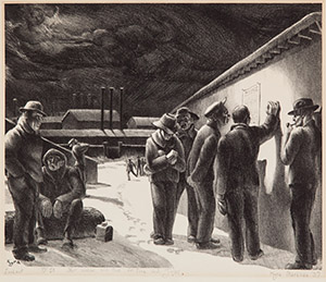 In the American Grain: Exploring America through Art, 1919–1946 September 4 to December 6, 2025 Opening reception: Thursday, September 4, 2025, 5:00–7:00pm The two-and-a-half decades between 1919 and 1946 witnessed the development of an American art that sought to capture a country in the midst of transformation. Through celebration and crisis, artists held up a mirror to their fellow citizens, showing their lives, their landscapes and their dreams. In the American Grain tells this story through artworks addressing a range of themes, drawn from the rich holdings of the Binghamton University Art Museum and Libraries, the Roberson Museum and Science Center and the Art Bridges Collection. In particular, the exhibition acknowledges the generosity of Gil and Deborah Williams, whose donations to the Art Museum are extensively featured here. Together, they reveal how history shaped art during these years, and how artists themselves responded to history in the making. This exhibition is curated by Tom McDonough, professor of art history. Support for this project is provided by Art Bridges. Samuel L. Margolies, American, (1897–1974), Men of Steel, 1936, published 1941, lithograph. Gift of Gil and Deborah Williams, 2016.4.326 |