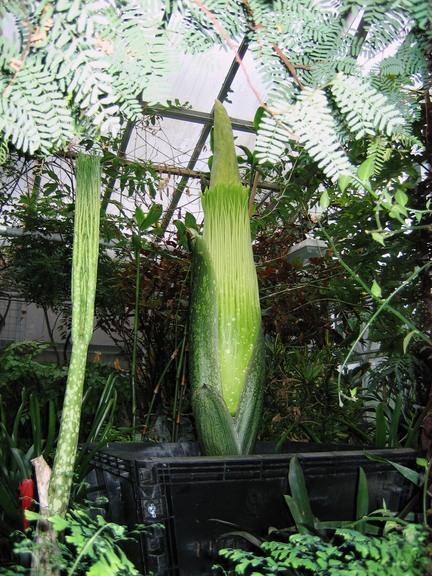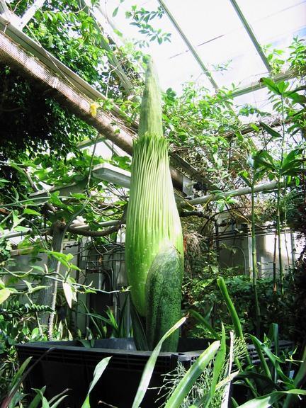 Our Titan Arum, named Metis, was donated in 2007 by John Kawamoto at the request of Binghamton University alumnus Werner Stiegler. John won three seeds in 2005 from an auction held in Bali, Indonesia. He grew the young plants for two years prior to donating one plant to BU in 2007. When we received the corm it weighed just over 4 lbs, but after one year of growth it weighed an incredible 40 lbs as it entered dormancy! In the three years Metis was in the Tropical Room prior to 2010 it put up two leaves, the last was 10 foot high and 10 foot wide. Metis put up an inflorescence in September of 2010, opening after four weeks of growth to a crowd of over 2,000 visitors. We collected pollen and sent one vial to Hawaii to another grower in the spring of 2011; the other vial went to Cornell University in the spring of 2012. Currently, the EW Heier Teaching Greenhouse has offspring of both those crosses.