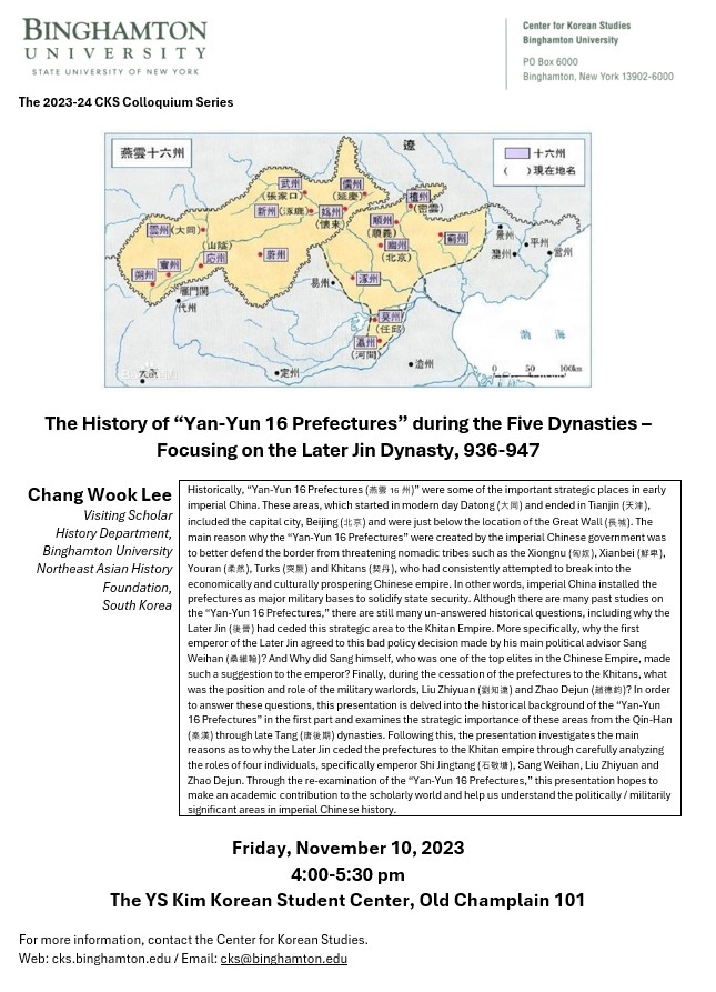 Historically, “Yan-Yun 16 Prefectures (燕雲16州)” were some of the important strategic places in early imperial China. These areas, which started in modern day Datong (大同) and ended in Tianjin (天津), included the capital city, Beijing (北京) and were just below the location of the Great Wall (長城). The main reason why the “Yan-Yun 16 Prefectures” were created by the imperial Chinese government was to better defend the border from threatening nomadic tribes such as the Xiongnu (匈奴), Xianbei (鮮卑), Youran (柔然), Turks (突厥) and Khitans (契丹), who had consistently attempted to break into the economically and culturally prospering Chinese empire. In other words, imperial China installed the prefectures as major military bases to solidify state security. Although there are many past studies on the “Yan-Yun 16 Prefectures,” there are still many un-answered historical questions, including why the Later Jin (後晉) had ceded this strategic area to the Khitan Empire. More specifically, why the first emperor of the Later Jin agreed to this bad policy decision made by his main political advisor Sang Weihan (桑維翰)? And Why did Sang himself, who was one of the top elites in the Chinese Empire, made such a suggestion to the emperor? Finally, during the cessation of the prefectures to the Khitans, what was the position and role of the military warlords, Liu Zhiyuan (劉知遠) and Zhao Dejun (趙德鈞)? In order to answer these questions, this presentation is delved into the historical background of the “Yan-Yun 16 Prefectures” in the first part and examines the strategic importance of these areas from the Qin-Han (秦漢) through late Tang (唐後期) dynasties. Following this, the presentation investigates the main reasons as to why the Later Jin ceded the prefectures to the Khitan empire through carefully analyzing the roles of four individuals, specifically emperor Shi Jingtang (石敬塘), Sang Weihan, Liu Zhiyuan and Zhao Dejun. Through the re-examination of the “Yan-Yun 16 Prefectures,” this presentation hopes to make an academic contribution to the scholarly world and help us understand the politically / militarily significant areas in imperial Chinese history.