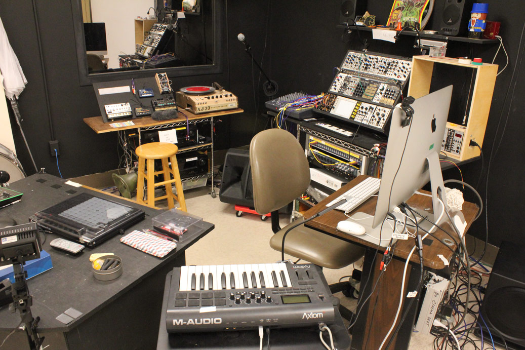 Sound Classroom: DAW & software packages Ableton Live, Pro Tools, Reaper, Isadora, & VCV Rack. Electronic Music Hardware includes: Moog Mother-32, Make Noise Eurorack Modular Shared System with Doepfer, Mutable, Bastl, & Folktek modules. Digital and Midi Interfaces: M-Audio, and Akai keyboards, MOTU Presonus, Akai and Push Launchpads, Korg Ribbon Synthesizers, Korg Volca's. Old School Analog Equipment: Burns Theremin, Turntables, Nagras,16mm Mag dubber, Mackie, Soundcraft, and Behringer mixers, Tascam 4-track cassette decks. Specialty equipment: Prepared piano soundboard, includes fully controllable solinoids and dc motors to strike strings or soundboard via Bastl Eurorack modules. Includes selection of mounted switchable transducers to utilize the board as a reverb chamber.