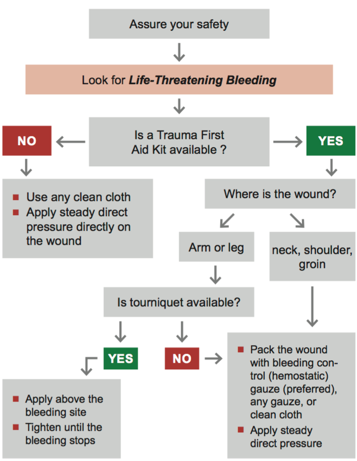 "Assure your safety, then look for LIFE THREATENING BLEEDING. Is a trauma kit available?