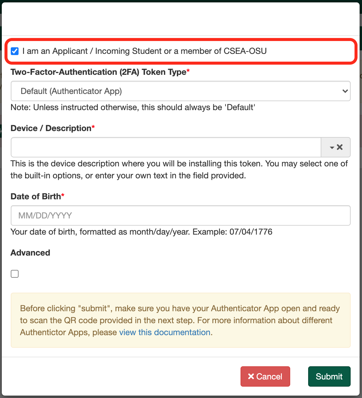 *You DO NOT need to change your password to create a token. - Check the box for "I am an Applicant / Incoming Student or a member of CSEA-OSU"