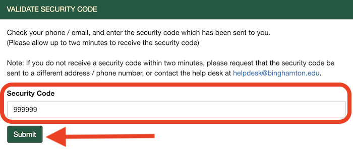- Enter the 6-digit Security Code received in the previous step into the space provided.