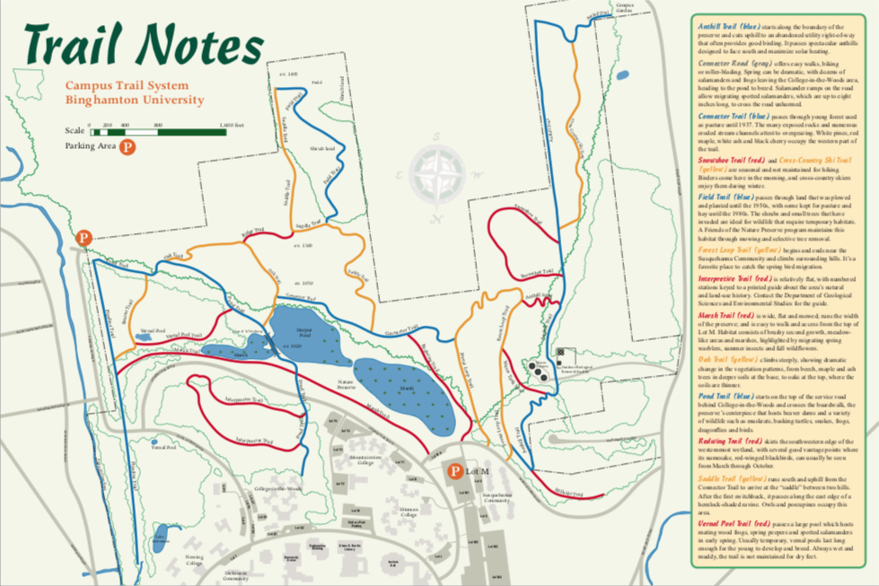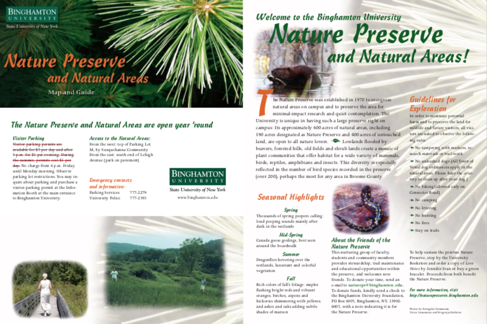 NOTE: Parking Information on the Brochure is Outdated. All Campus day passes are now $10 (all year long) or there are pay spaces in front of the main entrance to the Nature Preserve.