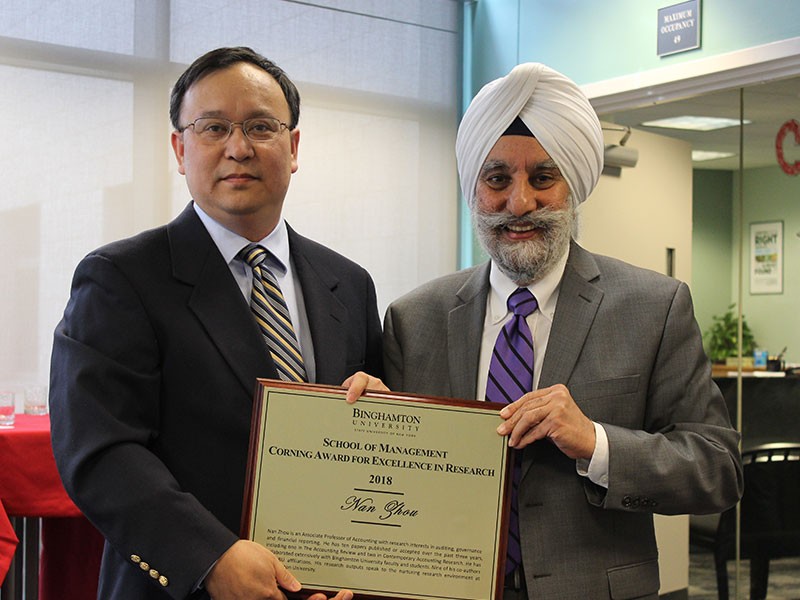 Nan Zhou is an associate professor of accounting with research interests in auditing, governance and financial reporting. He has had 10 papers published or accepted over the past three years, including one in The Accounting Review and two in Contemporary Accounting Research. He has collaborated extensively with Binghamton University faculty and students – nine of his co-authors have Binghamton University affiliations. His research output speaks to the nurturing research environment at the University.