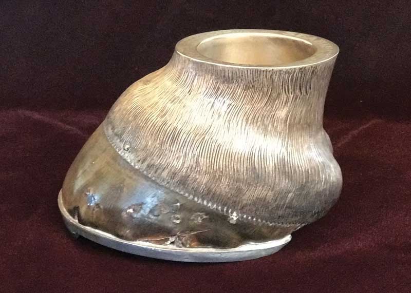 Seabiscuit’s hooves had been removed and silvered after his death, and were on display at the California Thoroughbred Foundation. While this practice is no longer customary, it was once common to silver the hooves of champion racehorses to use as keepsakes or even cigarette dishes.