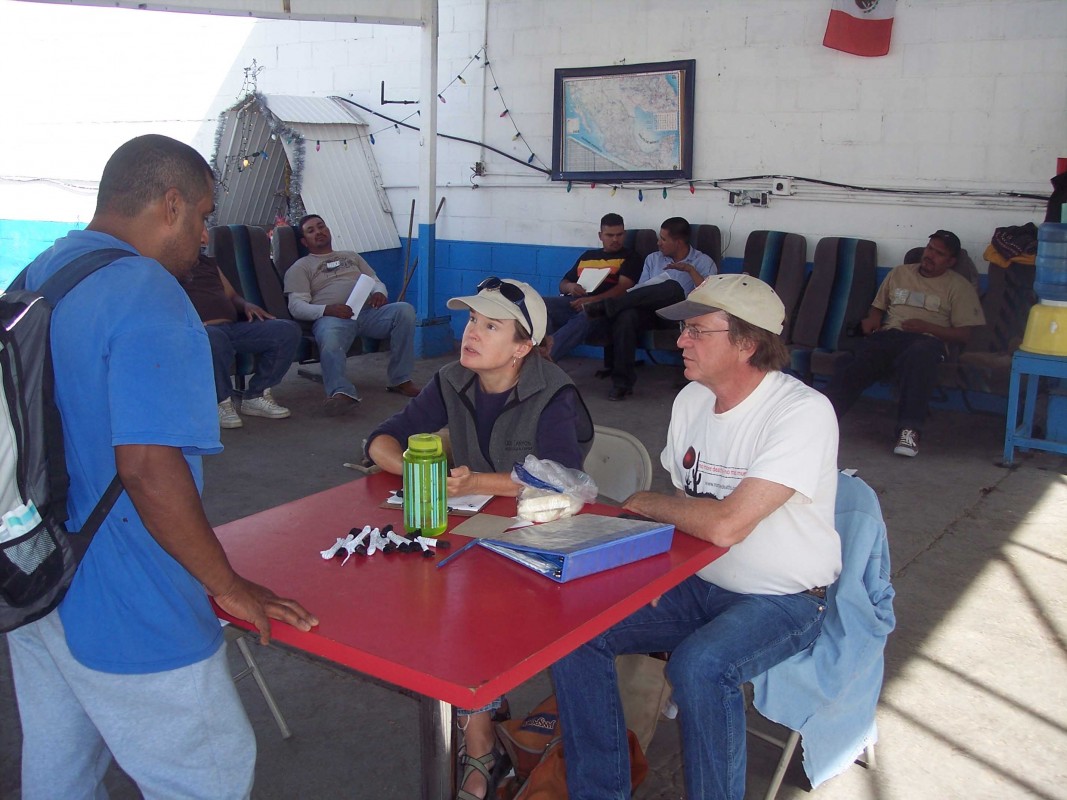 The U.S. government militarized the border in 1994 and built the first wall dividing Nogales, Arizona, from Nogales, Mexico, called Ambos Nogales, or Both Nogales. By 2006, the region was crammed with prospective border-crossers, and McGuire and Van Dyke talked to migrants in the streets, traveled to (but not beyond) the border with them, and contributed food and money to the Catholic Church’s relief efforts. Two years later, McGuire and Van Dyke began working with the humanitarian organization No More Deaths to provide aid to migrants, the border wall looming over their aid station. In 2011, the U.S. tore down the first wall and built a 30-foot barrier to replace it.