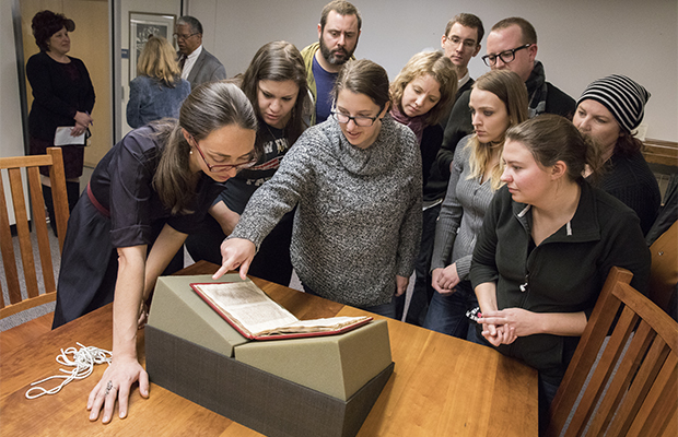 The words of a 14th-century scholar drew a crowd of students, faculty and staff to the Huppé Reading Room in the Glenn G. Bartle Library for the recent unveiling of the oldest parchment document on campus, “Postilla litteralis super epistolam ad hebraeoes.” (Literal Commentary on the Epistle to the Hebrews.)