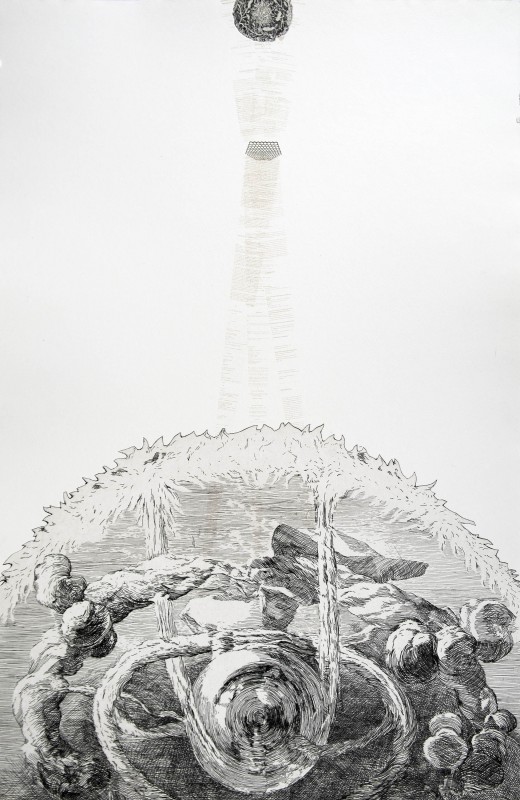 At Frans Masereel Centrum in Belgium this spring, Lyons worked on a series of etchings combining elements of geoengineering technologies with alchemical imagery. He began with a handmade etching, then layered it with odd inks made of iron sulfate, crude oil and sulfuric acid.