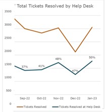 Our first point of contact from a user with an issue is the Help Desk. The chart to the left shows total calls received and calls resolved at the Help Desk, which is approximately 52% (or 2,000 calls) of all received calls. The Help Desk goal is to fully resolve a call within eight hours or less. Some top service requests consisted of new employee HR requests, 2FA/Google 2-step help, phishing response and remediation, student U-Drive requests, computer assistance and setup, and more.