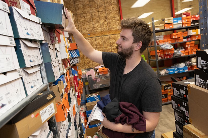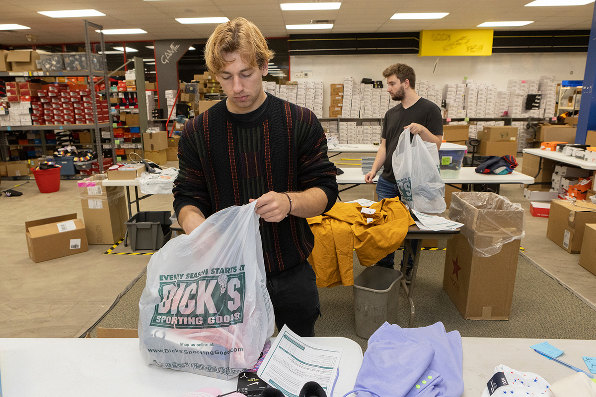 Inside an old warehouse in Binghamton, hundreds of boxes are stacked atop one another and fill the shelves with thousands of clothing items donated by Dick’s Sporting Goods.