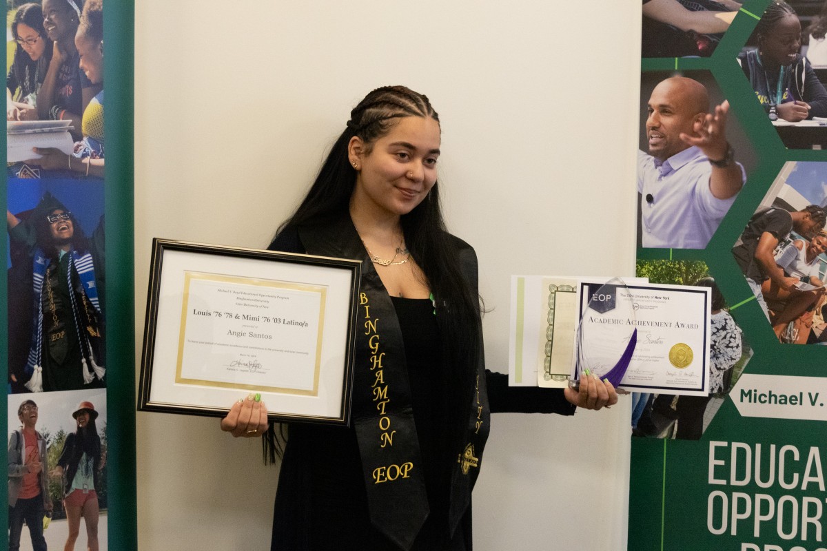 The Distinguished Student Award is the highest honor bestowed upon an EOP senior, acknowledging superior merit, outstanding academic achievement and campus engagement. This year, the award was presented to Ann Badia, a 4+1 biomedical engineering student at Watson College of Engineering and Applied Science. Badia is a Dean’s List honoree, an undergraduate course assistant and a student assistant in the Watson Career and Alumni Connections office. Badia is also involved with CSTEP, the McNair Scholars Program, and is vice president of the Society of Hispanic Professional Engineers (SHPE).