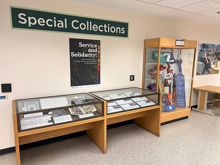 Service and Solidarity: the rise of historically Black fraternities and sororities, located on the mezzanine of the Glenn G. Bartle Library, explores the history of the National Pan-Hellenic Council (NPHC), also known at the Divine 9, and MALIK fraternities. The other half of the co-exhibit, Service and Solidarity: historically Black Fraternities and Sororities at Binghamton, on display outside of Special Collections in the Bartle Library North Reading Room, celebrates the groups recognized on campus and their contributions at Binghamton University throughout the years.