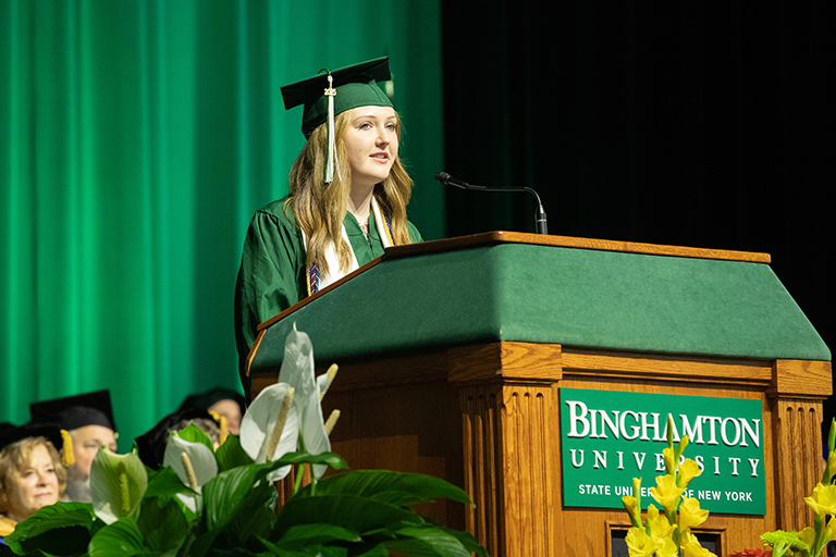 “Remember to define your value to prospective employers,” Hall said. “Show them that you know how to solve problems, that you learned to be a leader at Binghamton – and that you are a good communicator. These are all skills that come from your foundation in the liberal arts, and I can’t say enough about them. These skills will serve you well in whatever endeavors you undertake.”
