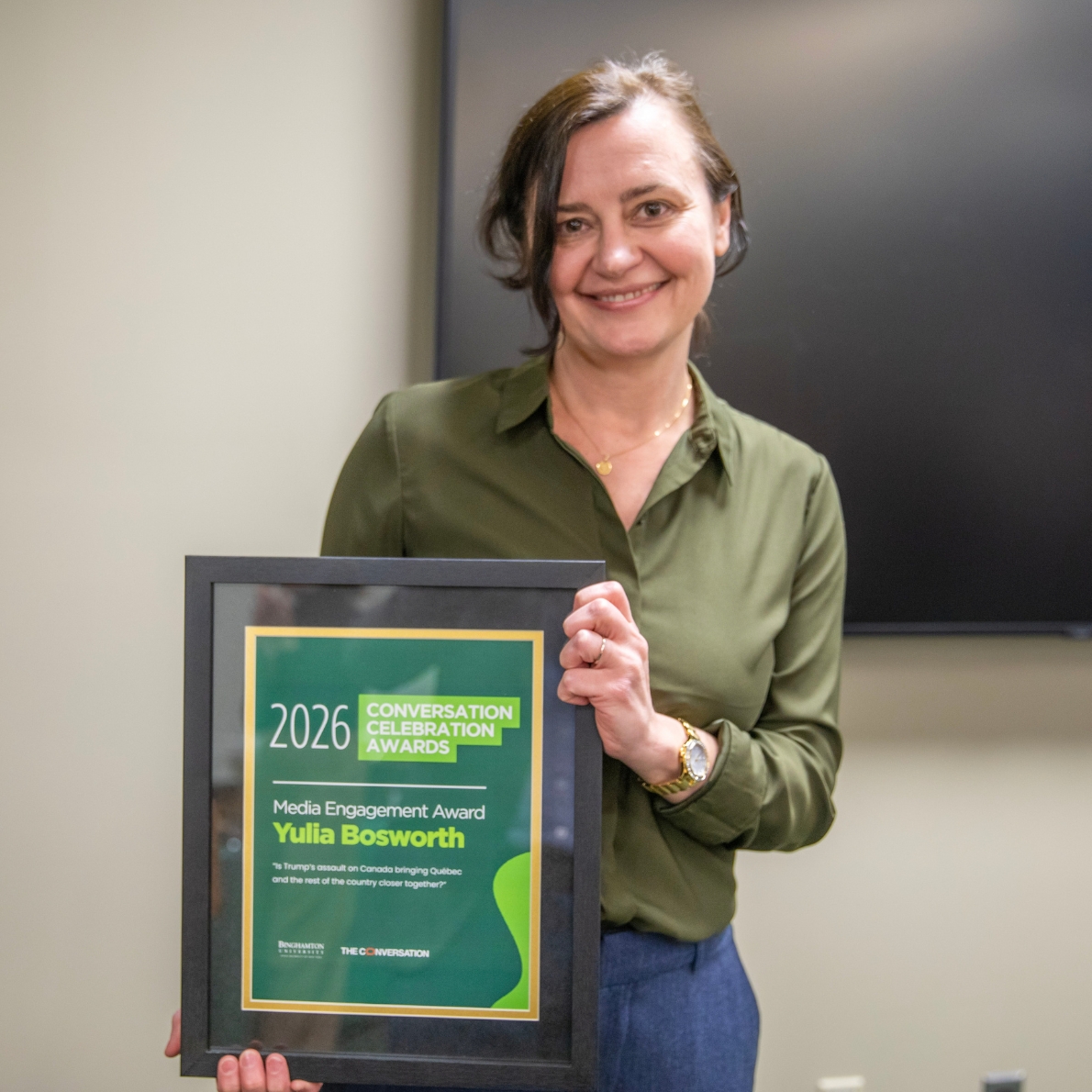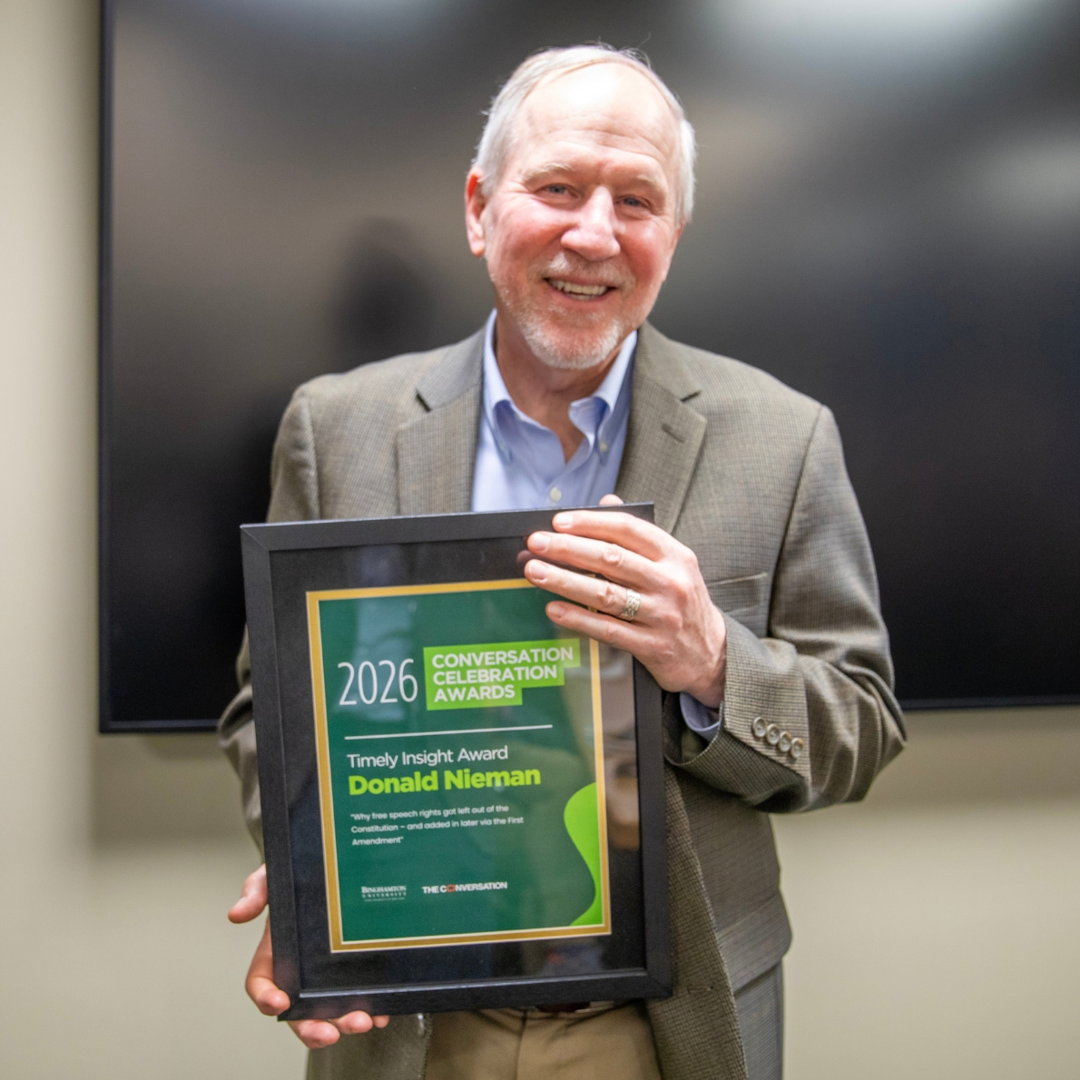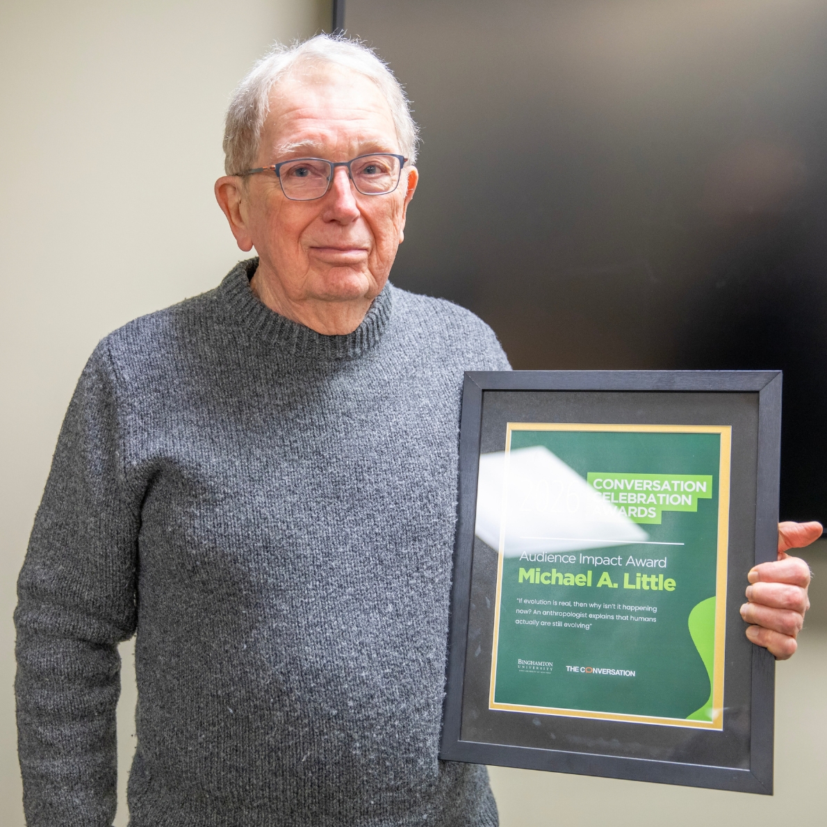 The event included the 2026 Conversation Celebration Awards, recognizing authors who achieved significant milestones. Three faculty were recognized for their articles: Associate Professor of Linguistics and French Linguistics Yulia Bosworth, Professor of History and Provost Emeritus Donald Nieman, and Distinguished Professor Emeritus of Anthropology Michael A. Little, the last of whom penned The Conversation’s most-read article in 2026.