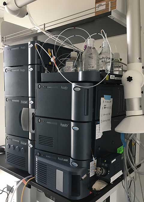 This multi-purpose instrument is used for purification of pharmaceutical agents and for the routine analysis of synthetic reactions. It is equipped with an SQD2 (single quadrupole) mass spectrometer with electrospray ionization capable of detecting compounds up to 3000 m/z. The pumps on this instrument are capable of delivering from 0.1 mL/min (analytical scale chromatography) to 150 mL/min (prep scale chromatography). The quad pumps can select from among four buffers, thus allowing facile switching between formic acid buffers (for analytical work) and TFA buffers (for preparative work). A column switcher can select from among five columns. The system is equipped with MaxEnt 3.1 deconvolution software, allowing for the analysis of protein samples, including antibodies. Our lab routinely uses this instrument both for purification/analysis of organic compounds and for studying antibody modifications.