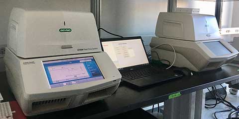These are real-time polymerase chain-reaction detection systems that can accommodate 96- and 384-well plates, utilizing five colors and one FRET channel detection to enable single- or multi-plex (up to five target) reactions to determine gene expression. They can run regular or fast PCR cycles using Taqman or SYBR technologies and their automated software can run all analyses for complex data sets. Additional utilities of these systems include any combination of fluorescence and temperature measurements, including FRET Melt and genomic mutation detection. Go online for a video tour and more details on the CFX96 and the CFX384.