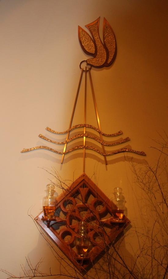 In 1997 - 1999, Donald McManus, a member of the parish, re-utilized parts of the altar rail and constructed the altar table. The table was brought forward so as to have it more centrally located. When the atrium was built there was a confessional similar to the one on the opposite side of the church. The wood panels from this confessional were preserved and later used by the Mr. McManus to construct the pulpit and the Sacred Oils display.