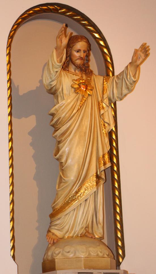 To the right of the main altar are the statues of Jesus the Sacred Heart and the Baptismal Font with the Sacred Oils.