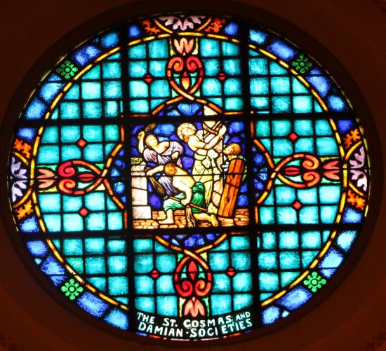 Located above Sts. Cosmos and Damian is the North Rose Window depicting the "The Scourging at the Pillar"