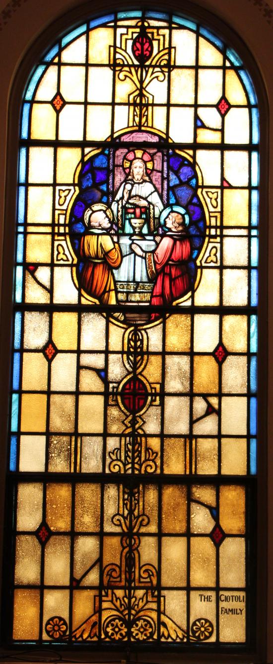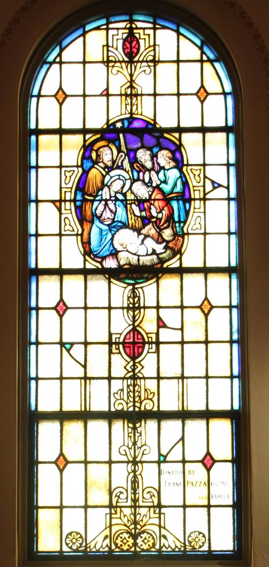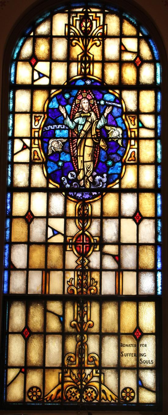 The stained glass windows were installed in 1942 and were donated in memory of parishioners' intentions. The memorial is stenciled on the glass.
