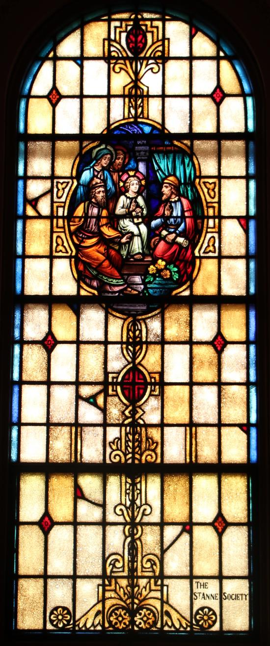 Located in the back of the church in the choir loft is the Façade Rose window. This window depicts the Holy Family.