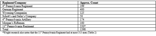 Wright's research indicated that approximately 1,400 soldiers were under the command of General Hand on the march from Wyoming to Tioga. The number of men Hand mustered out for the attack on Chemung is not reflected in the pre-campaign rosters.