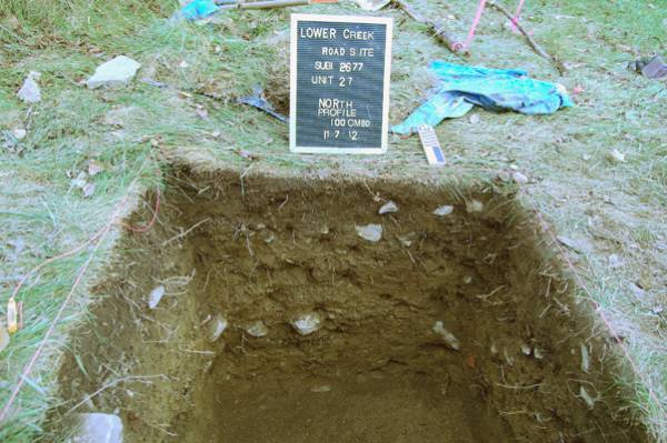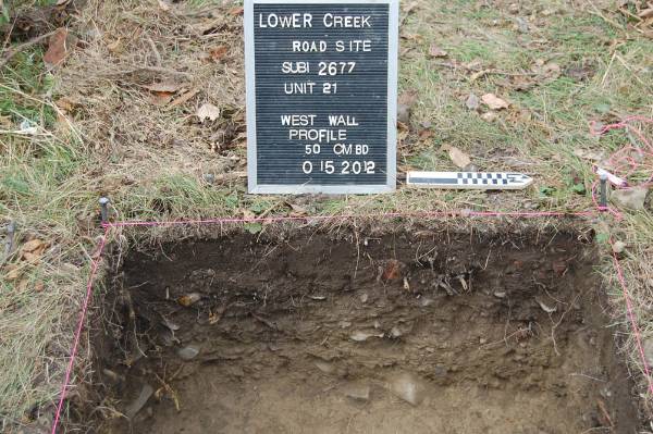 PAF crews initially identified the Lower Creek Road Site during a reconnaissance survey in 2007. The site consisted of a moderate density sheet midden (refuse scatter) around a stone foundation. The foundation had been a residence built prior to 1853 and demolished between 1898 and 1900 based on historic maps. Archaeologists recovered 92 historic artifacts from a grid of shovel test pits (STPs) placed at an interval of 7.5 m (25 ft). The site measured approximately 30 m (98.4 ft) long and 25 m (82 ft) wide for a total site area of 750 m² (8,073 ft²). Based on the results of the survey, PAF archaeologists recommended a site examination as well as archival research to determine the site’s eligibility to the National Register of Historic Places.