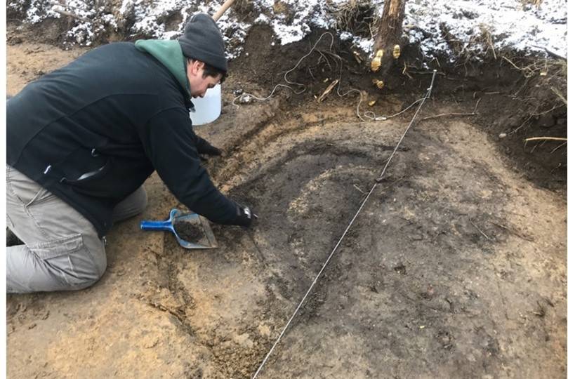 Archaeologist starting to bisect a hearth feature after mechanical soil removal.
