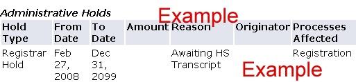 The hold status will describe the hold, identify what processes are affected, and indicate the office responsible for the hold. Students must contact the proper office to release the hold. It may take up to 24 hours for the student record system to clear a hold.