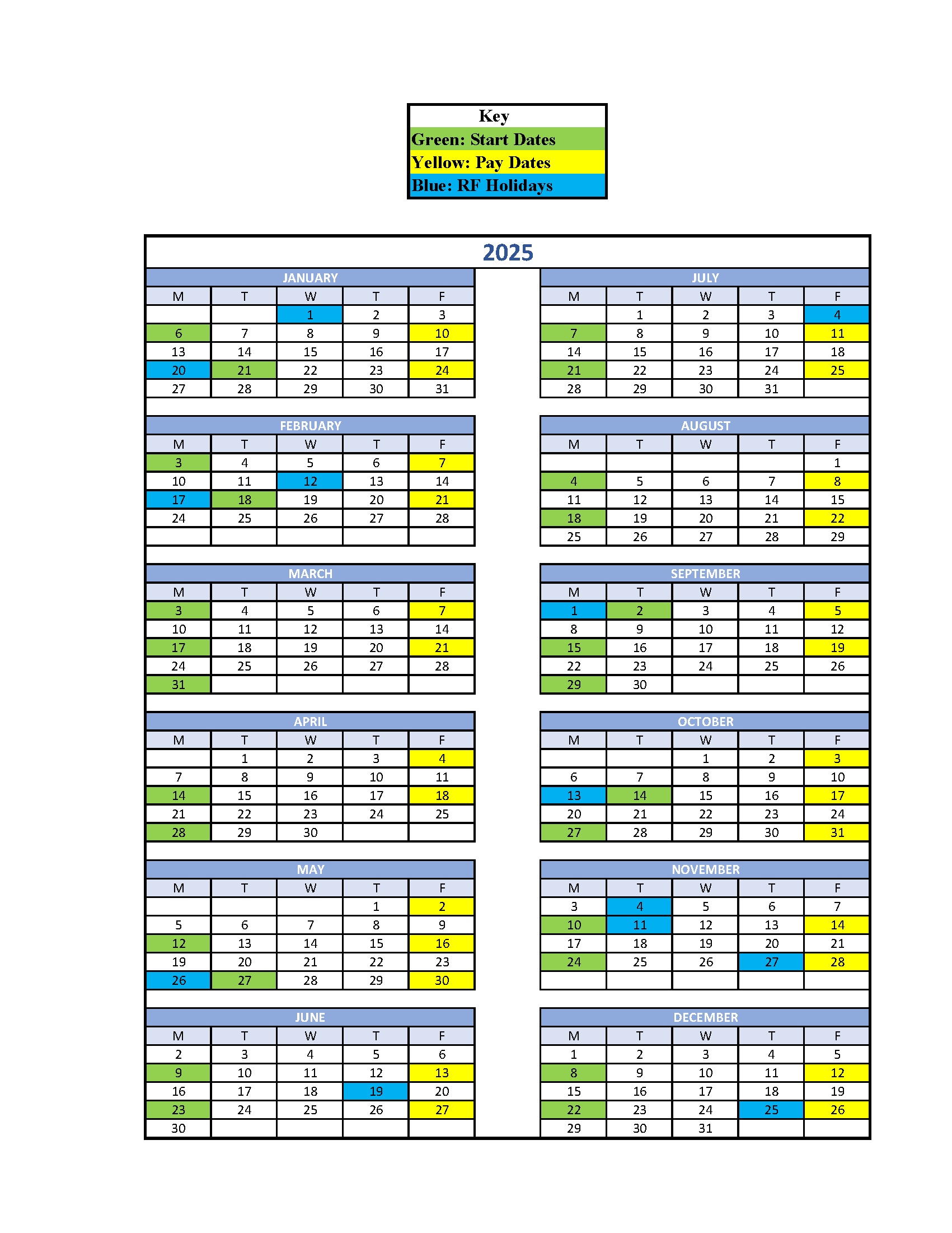 In order to allow for the best new hire experience the Research Foundation Office of Human Resources (RF HR) highly recommends that you start your new employees on the start dates outlined below (green boxes). Starting your employees on these designed dates will allow RFHR the necessary time to engage with your new hire and the multitude of outside offices required to establish an employee record (ie: ITS, SUNY Secure, Parking Services, etc). Furthermore, all hiring managers should submit their electronic appointment form over to RFHR two weeks before the new employees intended start date. This will allow RFHR to send your new employee their New Hire Welcome Packet and allow ample time to complete all subsequent new hire steps (up to and including an in-person meeting to complete a Form I9). Any new hire whose electronic appointment form has not been received by RFHR in accordance with our payroll deadlines may experience a delay in their pay. Furthermore, all new hires must complete all required new hire steps before our payroll deadlines to ensure their new hire records are established and that they are paid promptly.