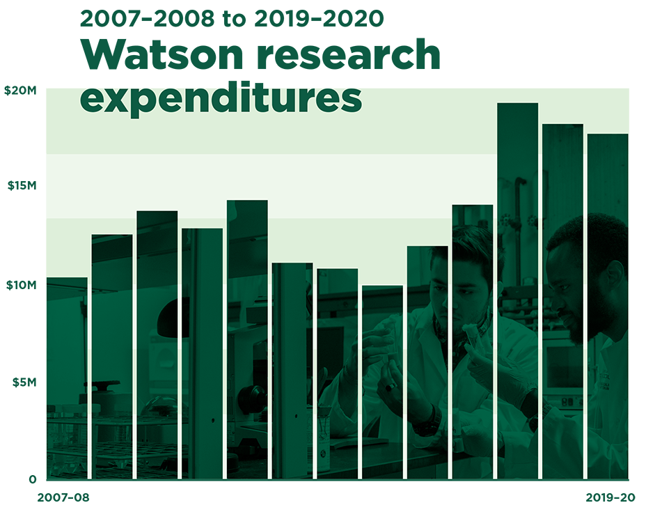 Our faculty also has grown. Just in the past 20 years, Watson College has gone from 43 tenured/tenure-track professors to 97. In addition to educating our students, they conduct research vital to the future of science and technology. In the 2018-19 academic year, each tenured/tenure-track faculty member at Watson averaged $200,000 in research expenditures.